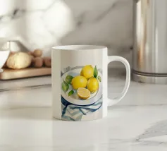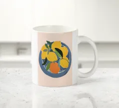 Een mediterraan stilleven met citroenen en bladgroen in zachte pastelkleuren wordt gepresenteerd in een grafisch ruitpatroon. Deze op vintage geïnspireerde illustratie brengt een tropische zomerflair in elke keuken en viert de versheid van biologisch fruit en groenten.