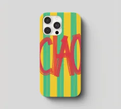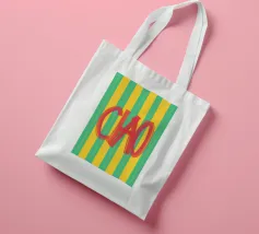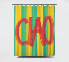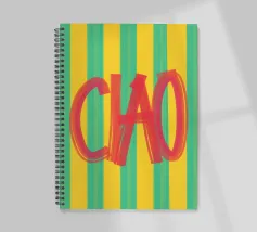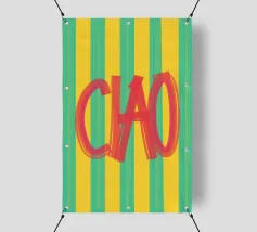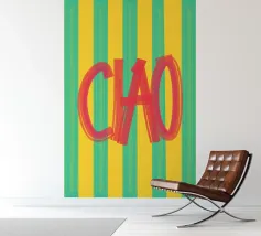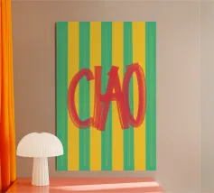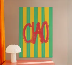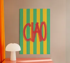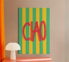 Speelse typoposter met Italiaanse flair: de handgeschilderde "CIAO!" letters in levendig rood contrasteren met de gestreepte achtergrond in zonnig geel en turquoise. De mix van een losse penseellook en retro kleuren maakt het ontwerp de perfecte blikvanger voor keukens, gangen of creatieve studio's. Een vrolijke groet - luid, kleurrijk en charmant mediterraan.