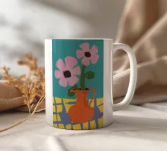 Een gestreepte witte en blauwe vaas bevat gele en roze bloemen tegen een levendige, quiltachtige achtergrond van roze, oranje en rode bloemmotieven.