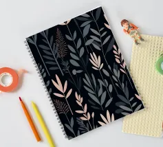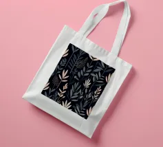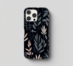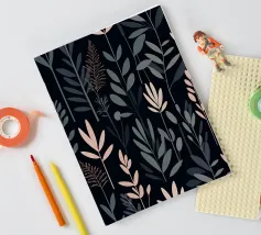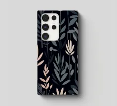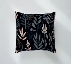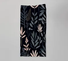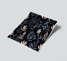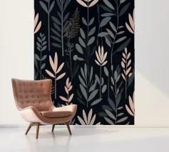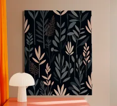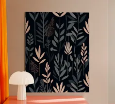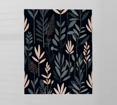 Deze elegante abstracte botanische print heeft een harmonieuze mix van delicate bladeren en bloemen in rustgevende tinten blauw, groen en perzik. Het patroon is geplaatst tegen een diepzwarte achtergrond, waardoor een verfijnde en rustgevende sfeer ontstaat. Perfect om een vleugje natuur toe te voegen aan je interieur.