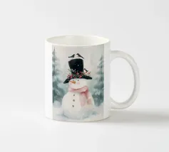 Een sneeuwpop, compleet met hoge hoed en sjaal, begroet de winteravond in een sereen bos. Sneeuwvlokken vallen zachtjes in het rond en creëren een magische sfeer.