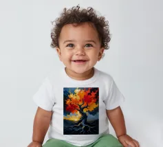Dit fascinerende olieverfschilderij heeft een dramatische, abstracte interpretatie van een boom die wordt overspoeld door levendige vlammen. De rijke impasto-techniek creëert een verbluffend gevoel van textuur en beweging, met dikke streken van vurige sinaasappels, rood en geel die het gloeiende bladerdak van de boom vormen. De donkere, knoestige stam en wortels verankeren het inferno tegen een sombere, stormachtige lucht weergegeven in diep blauw, grijs en hints van een onheilspellende oranje gloed aan de horizon. Dit werk roept krachtige emoties op van passie, vernietiging en veerkracht, waardoor het een unieke en opvallende toevoeging is aan elke kunstcollectie.