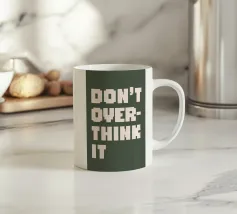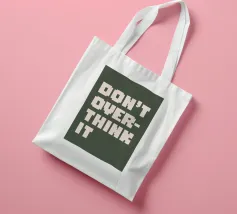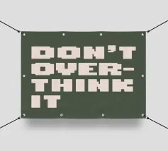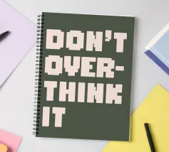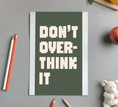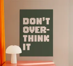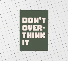 Een minimalistisch ontwerp met een verwarde bal van kleurrijke draden die zich langzaam ontrafelt tot een rechte lijn. De zin "Denk er niet te veel over na" wordt weergegeven in strakke, moderne typografie, die zachtjes vervaagt van vet naar licht om een kalme helderheid weer te geven. De serene achtergrond in zachte pasteltinten versterkt de boodschap van eenvoud en loslaten.