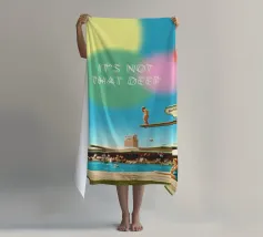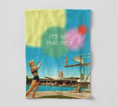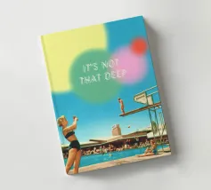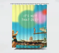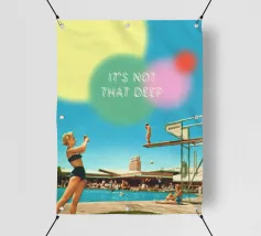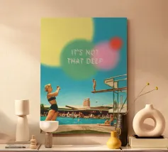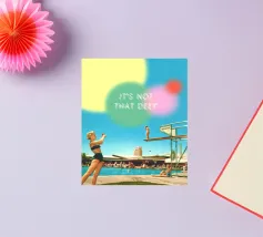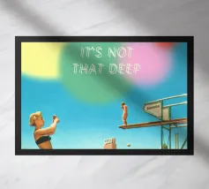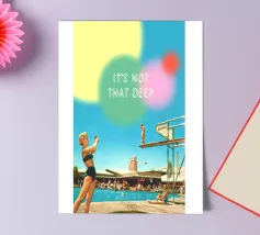 Vrouw neemt een foto van een man die op het punt staat op het zwembad te springen. Gradiënt aura lucht en citaat 'It's not that deep'. Surrealistisch retro ontwerp met een vintage motelzwembad door MsGonzalez