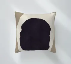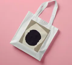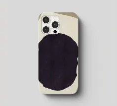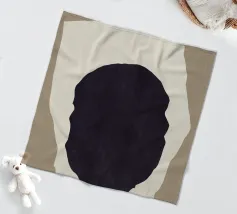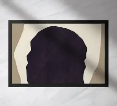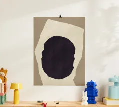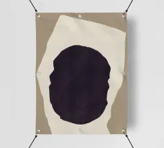 Een grote, onregelmatige zwarte vorm staat centraal op een contrasterende, lichtere achtergrond met een ruwe, gescheurde look. Het ontwerp is minimalistisch, met een abstract gevoel en een eenvoudig kleurenpalet.