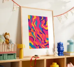 Een gedurfd abstract patroon met een vleugje dynamische energie dat beweging en vloeibaarheid symboliseert. Heldere kleuren die thema's als water, leven en beweging oproepen. Een innovatieve fusie van traditie en moderniteit voor eigentijdse, minimalistische interieurs. Een unieke visuele taal die culturele grenzen overstijgt.