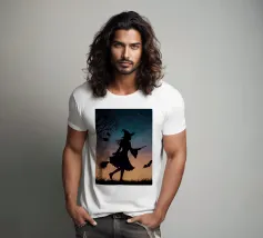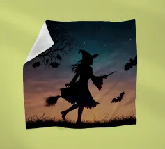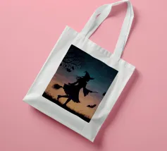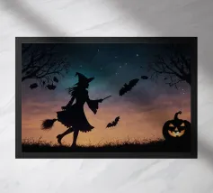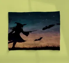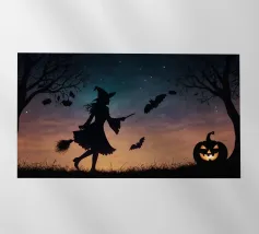 Als de schemering intreedt, zie je een silhouet van een heks op haar bezemsteel tussen de vleermuizen vliegen, met een gloeiende pompoen op de voorgrond, wat een betoverende sfeer creëert.
