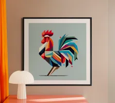 Artistieke afbeelding van een kat in abstracte stijl met kleurrijke oppervlakken - speels, modern en vol expressiviteit. Kattenmotief in geometrische kleurbloktechniek Harmonieuze, warme en levendige kleuren Eigentijdse interpretatie van een dierenklassieker Ideaal voor liefhebbers van moderne kunststijlen Expressief, creatief en veelzijdig