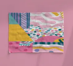 Een abstract patroon combineert patchworkachtige kleurblokken met energieke krabbels en strepen, waardoor een dynamisch, speels en artistiek ontwerp ontstaat.