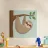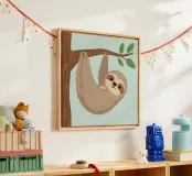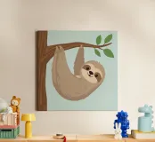 Schattige tekenfilmsluiaard hangt ondersteboven aan een bruine tak canvas