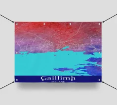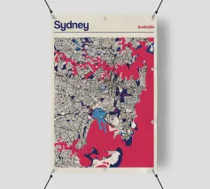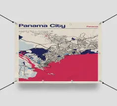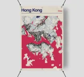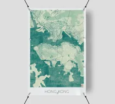 Een artistieke stadsplattegrond van Hongkong die de harmonieuze combinatie van stadslandschap en kustlijn vastlegt in heldere structuren en kleuren.