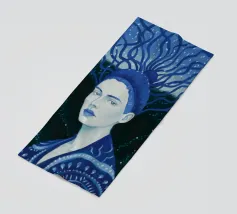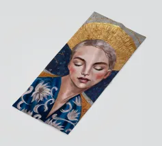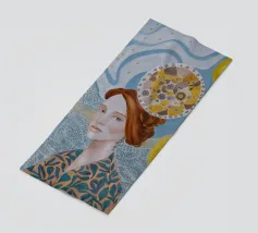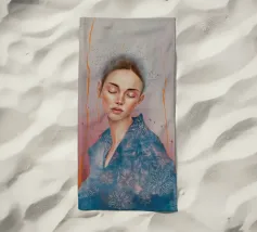 Een delicaat portret van een vrouw met vloeiend blond of lichtbruin haar, haar ogen gesloten of naar beneden kijkend, met een ingewikkeld gedetailleerd blauw en zilver of wit gewaad dat kant of een harnas suggereert.