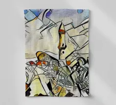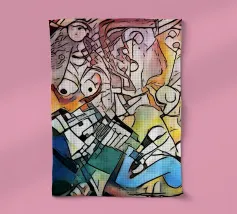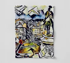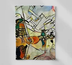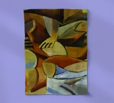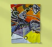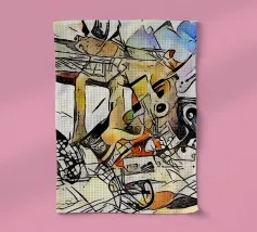 Dit levendige en energieke abstracte schilderij heeft een dynamisch samenspel van gefragmenteerde vormen en gedurfde lijnen, barstend van een rijk palet van sinaasappels, geel, paars en blauw. De compositie suggereert gedeconstrueerde elementen, mogelijk figuren of objecten, in een wervelende, energieke beweging, kenmerkend voor kubistische en abstract expressionistische invloeden. De ingewikkelde details en contrasterende kleuren creëren een boeiende en tot nadenken stemmende visuele ervaring. Deze digitale poster van hoge kwaliteit (7000x5000 pixels, 300 dpi) vangt op magnifieke wijze de rauwe energie en artistieke genialiteit van het origineel.