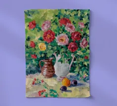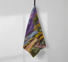 A colorful landscape painting depicts a village nestled on a hillside with vibrant, patchwork-like fields in shades of green, blue, and purple, with red-roofed houses under a clear sky.