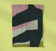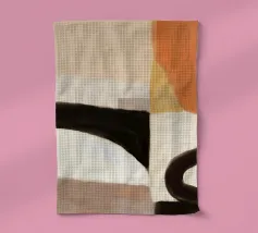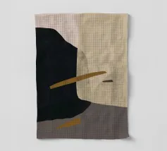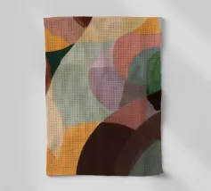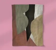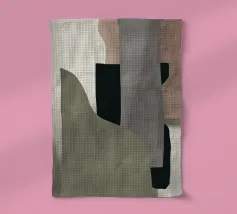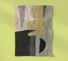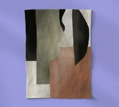 Abstracte vormen in gedempte tinten creëren een harmonieuze compositie. Verschillende tinten bruin, zwart en beige domineren de visuele ruimte met subtiele accenten van groen en wit.