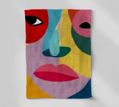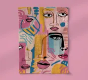 Een op kubisme geïnspireerd kunstwerk met meerdere overlappende en gefragmenteerde gezichten. De gedurfde lijnen en het levendige kleurenpalet creëren een dynamische en expressieve compositie die verschillende facetten van identiteit verkent.