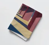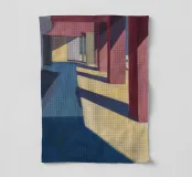 De grimmige geometrie van een overdekte wandelgang wordt gedefinieerd door krachtige karmozijnrode pilaren en de lange, scherpe schaduwen die ze werpen in het felle zonlicht. Dit schilderij is een krachtige studie van licht, schaduw, kleur en architectonische vorm.