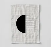 Minimalistisch geometrisch kunstwerk met zwarte lijnen en een zwarte halve cirkel tegen een neutrale, zachtbeige achtergrond.