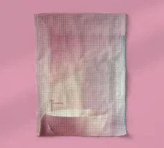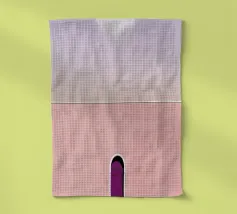 Een serene ruimte versierd met zachtroze muren en grote ramen die zacht zonlicht binnenlaten en delicate schaduwen op de vloer creëren. Een pluizige textuur versterkt de rustige sfeer.
