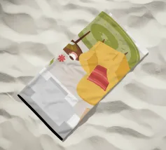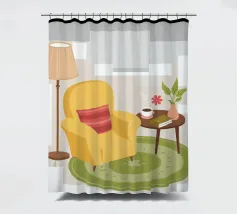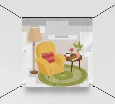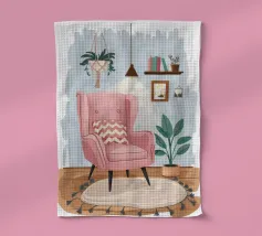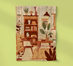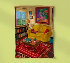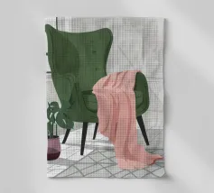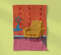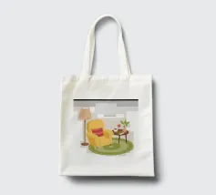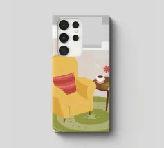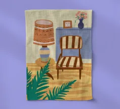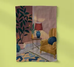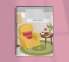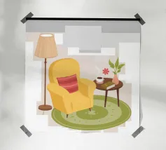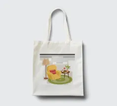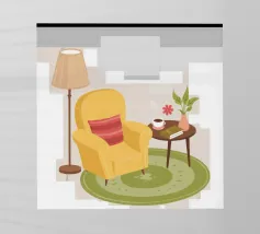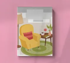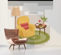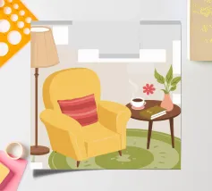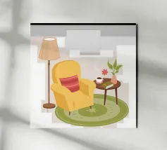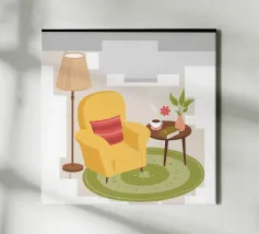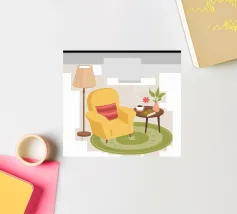 Een gezellige illustratie van een leeshoek met een comfortabele gele fauteuil, een staande lamp en een bijzettafeltje met een plant. De scène is een warm, uitnodigend en perfect toevluchtsoord om rustig te lezen en te ontspannen.