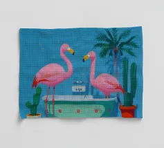 Een nostalgische Palm Springs scène: een roze flamingo zwemband drijft in een turquoise zwembad, omlijst door zachte pastelkleurige ligstoelen en torenhoge palmen. Dit kunstwerk brengt een retro zomersfeer, ontspannen vakantiestemming en mid-century charme aan elke muur - ideaal voor woonkamers, slaapkamers of een stijlvolle inrichting aan het zwembad.