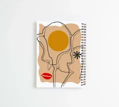 A continuous line drawing creates an abstract face with red lips and a star, overlapping with a sun shape on a textured background, blending minimalism and surrealism.