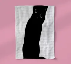 Een minimalistische zwart-wit illustratie van een slanke, zwarte kat met overdreven wijde ogen en schetsmatige trekken. Het grillige en abstracte ontwerp van de kat voegt een speels, artistiek tintje toe.