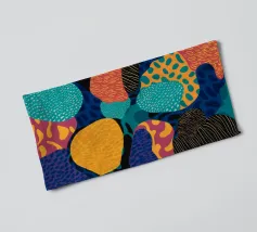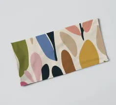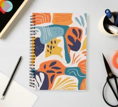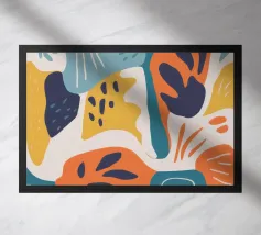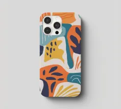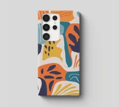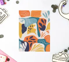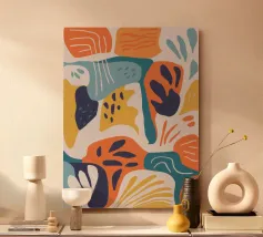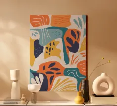 Een dynamische abstracte compositie van overlappende botanische en landschapsvormen in een warm palet van oranje, groenblauw en beige, waardoor een moderne en energieke interpretatie van de natuur ontstaat.