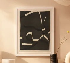Een minimalistisch ontwerp met horizontale banden van verschillende kleuren. De compositie bevat tinten groenblauw, beige, bruin en zwart.