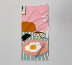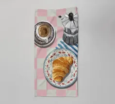 Een bovenaanzicht van een ontbijttafel met een croissant, spek, eieren, koffie en een brief. De stijl is modern, strak en legt een perfect ochtendmoment vast.