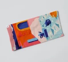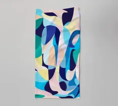 Een abstracte compositie van overlappende, gedeconstrueerde vormen in een ritmische opstelling. Het palet van blauwe, oranje, gele en nude tinten creëert een dynamisch en harmonieus stuk met een gevoel van vloeiende beweging.