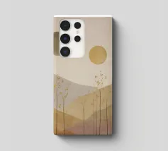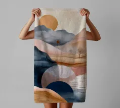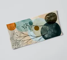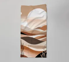 Boho muurkunst met gelaagde vormen in een landschap in roest, oker en beige - perfect voor Scandinavische, retro of eclectische interieurs.