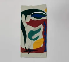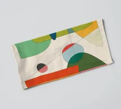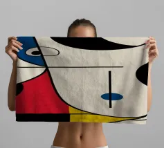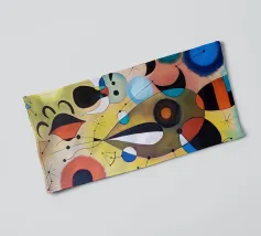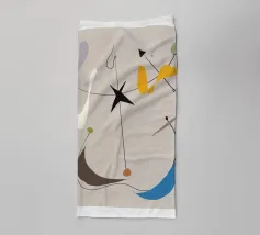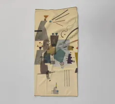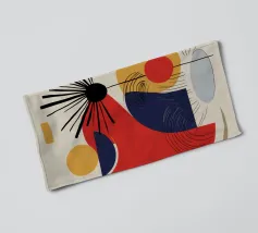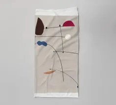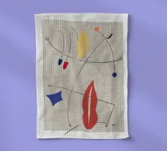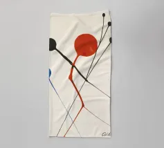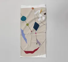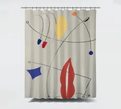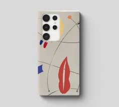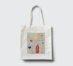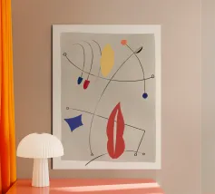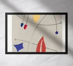 Abstracte vormen en lijnen creëren een dynamische compositie met een neutrale achtergrond. Gedurfde kleuren zoals rood, blauw en geel zijn verspreid over het werk, verbonden door vegende zwarte lijnen.