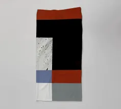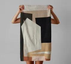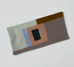 Een reeks geometrische vormen en kleurblokken is samengesteld in een moderne, abstracte stijl. Gestructureerde zwarte vierkanten zijn centrale elementen tegen de gladde achtergrond van gedempte groene, bruine en taankleurige tinten.