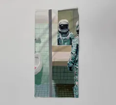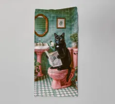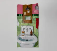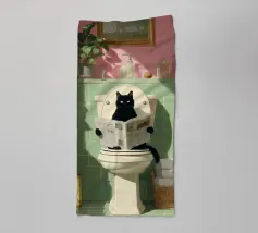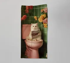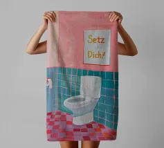 Een humoristische badkamerposter in zachte pastelkleuren met de vrolijke tekst "Ga zitten" nodigt uit tot een glimlach op het gastentoilet. Met minimalistische graphics en toiletpapier en handgetekende elementen creëert het een leuke sfeer en geeft het een duidelijke boodschap tegen opstaan om te plassen!