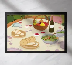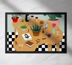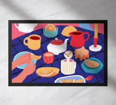 Een grillige illustratie van een kop dampende koffie in een blauw-wit geruit kopje, met gestileerde bloemen die erboven zweven, tegen een donkerblauwe, golvende achtergrond.
