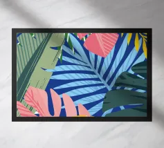 Een verfijnde compositie combineert blokken van tropische bladpatronen met effen kleurvlakken en geometrische vormen. Het patchworkontwerp in blauw-, roze- en groentinten creëert een evenwichtig en stijlvol stuk dat zowel modern als natuurlijk is.