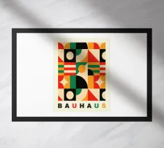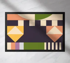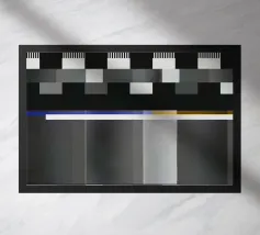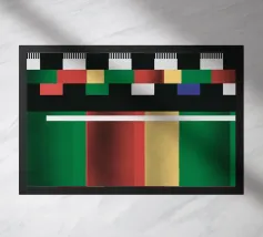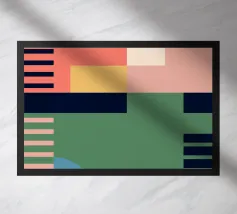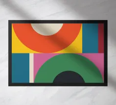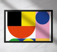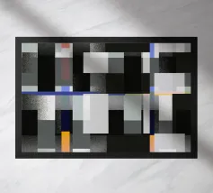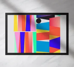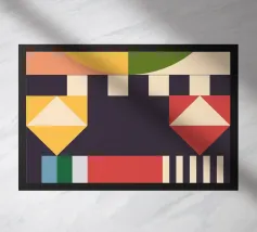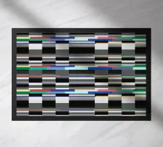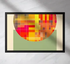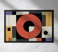 Een compositie van geometrische patronen bestaat uit een cirkel met gedurfde verticale strepen in rood, geel en groen, doorsneden door horizontale balken en omringd door verschillende geruite en effen rechthoeken. Een mix van heldere en gedempte kleuren, samen met scherpe lijnen