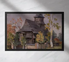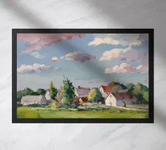 Een schilderachtig herfstlandschap met een dorp of boerderij genesteld op een heuvel, omringd door een lappendeken van kleurrijke bomen in oranje en gele tinten en gecultiveerde velden, met in de verte blauwe bergen die het tafereel compleet maken.