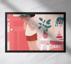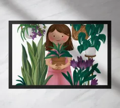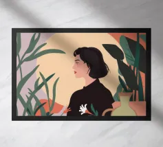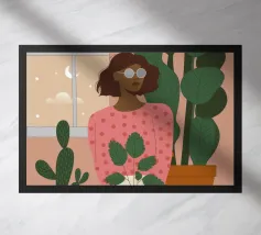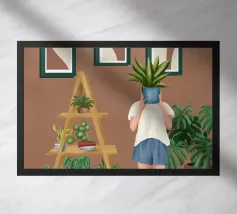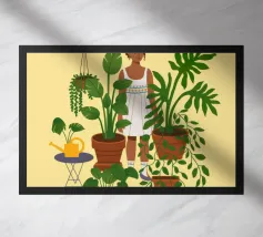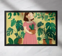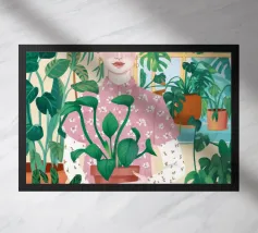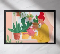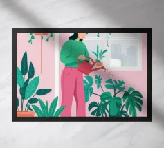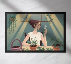 Een oudere vrouw verzorgt haar planten in een kamer met zachte tinten. Ze drukt wijsheid, kalmte en een tijdloze verbondenheid met de natuur uit.