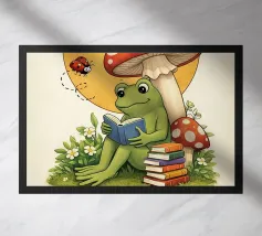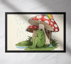 Een levendige en grillige scène met een felroze kikker bovenop een rode paddenstoel met witte vlekken, omringd door weelderig gebladerte en gloeiende bloemen in een mistig, betoverend bos. De magische sfeer versterkt de surrealistische schoonheid.