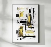Modernes abstraktes Grafikdesign mit einem Hauch von Eleganz. Experimentelle Vektormalerei mit verschiedenen Pinseln in Schwarz und Weiß mit goldenen Highlights. Dynamisches und sehr ansprechendes zeitgenössisches Design.