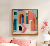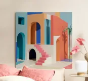 A surreal architectural composition of arches, stairs, and doorways in a soft pastel palette of pink, blue, and beige. A lone palm tree adds a touch of nature to this tranquil and dream like labyrinth.