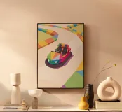 Een illustratie van een kleurrijke botsauto in een spelarena met een moderne geometrische stijl.