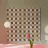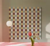 A pattern of alternating colored squares creates a checkerboard effect with shades of beige, gray, and brown. The grid-like design is symmetrical and evenly spaced.