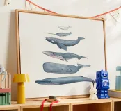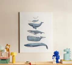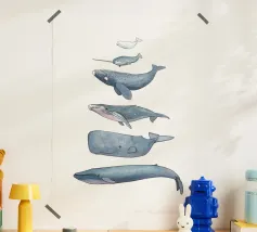 Hand-drawn illustrations of various whales in ink and watercolours.