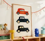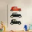 De afbeelding toont drie gestileerde retro auto's die kleurrijk en grafisch zijn vormgegeven. Elke auto heeft een uniek patroon - van stippen tot eenvoudige kleurvlakken. De felle kleuren en strakke lijnen geven de afbeelding een speelse en illustratieve esthetiek, die doet denken aan moderne popart of vereenvoudigde grafische ontwerpen.