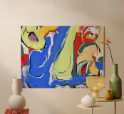 Bold swirls of blue and green intertwine with vibrant red and orange, creating a dynamic and energetic composition. Abstract forms and broad brushstrokes evoke a sense of motion and fluidity