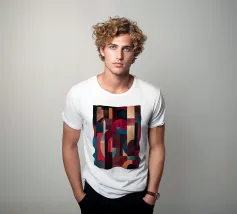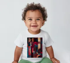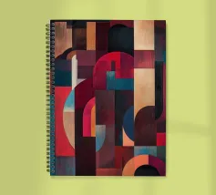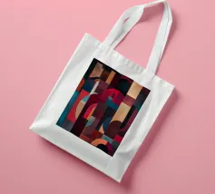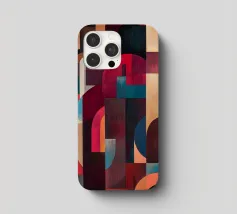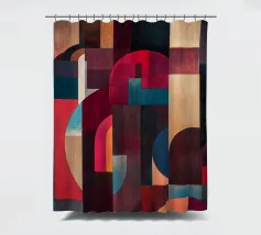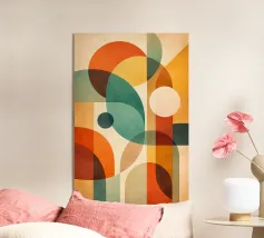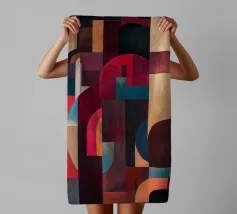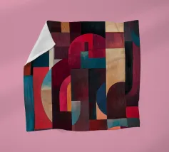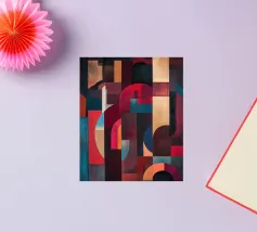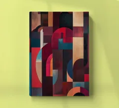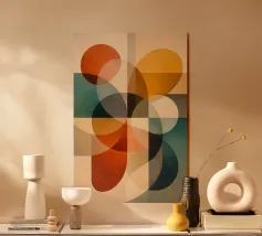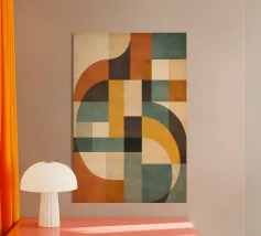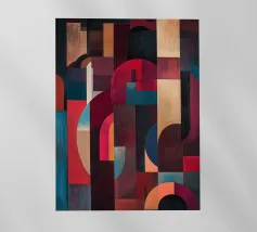 A rich, contemporary abstract composition built from layered geometric forms and deep, atmospheric colour. Curves and blocks intersect in a carefully balanced arrangement, creating a sense of architectural rhythm and visual depth. The surface texture adds a subtle, painterly warmth, softening the geometry and giving the work a tactile, crafted presence.