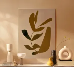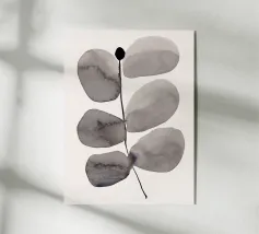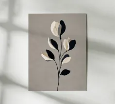 Een minimalistische compositie waarin zachtgrijze bladeren opduiken tussen krachtige, donkere cirkelvormige vormen. De verticale uitlijning suggereert rustige groei, terwijl het ingetogen palet van zwart, grijs en beige een stemmige, contemplatieve aanwezigheid verleent die perfect is voor verfijnde interieurs.